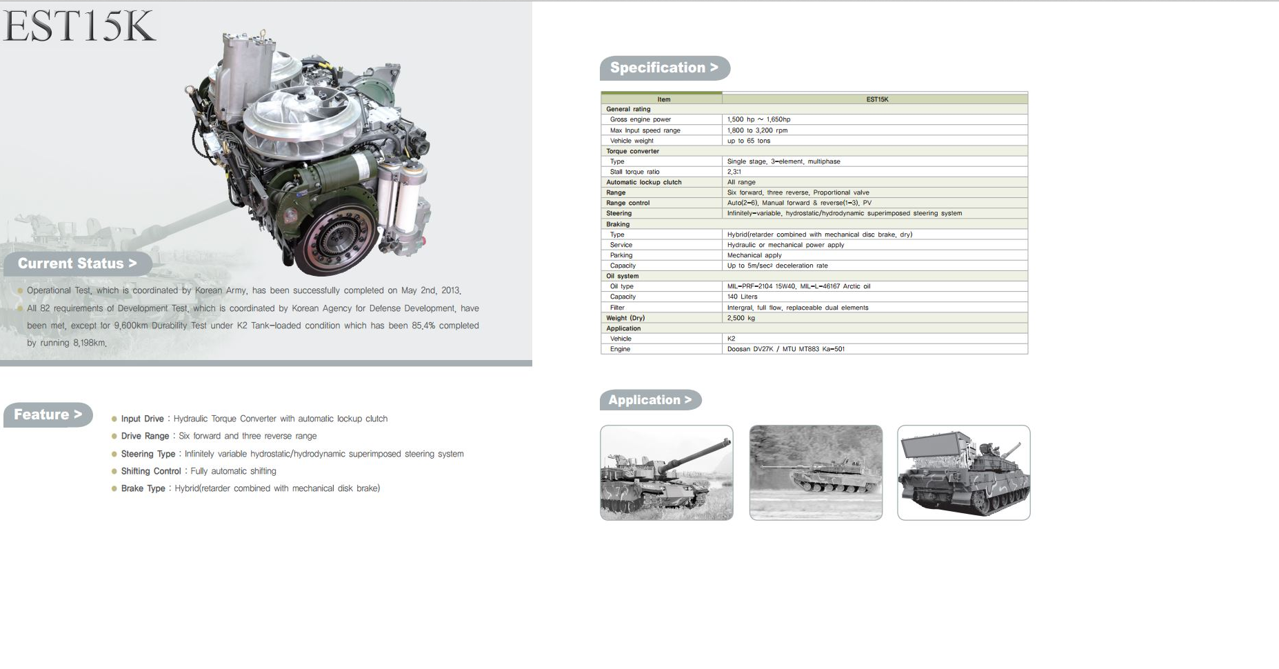 According to the S&T Dynamics Military Products Catalog, the Operational Tests of the EST15K system, which were carried out in coordination with the Republic of Korea Army (ROKA), were completed on May 2, 2013. During the Development Tests conducted in coordination with South Korea's Agency for Defense Development (ADD), it has met all 82 requirements, except the 9,600km durability test. According to the company's claim, a K2 MBT (full combat weight) equipped with the EST15K Transmission was able to complete 85.4% (8,198km) of the required 9,600km during the Durability Test. However, according to an article written by Kim Byung-WOOK in South Korea on July 16, 2020, it was claimed that the EST15K Transmission system failed 6 times during the performance tests (durability tests) conducted in 2014, and the transmission failed after 237 hours of continuous operation.