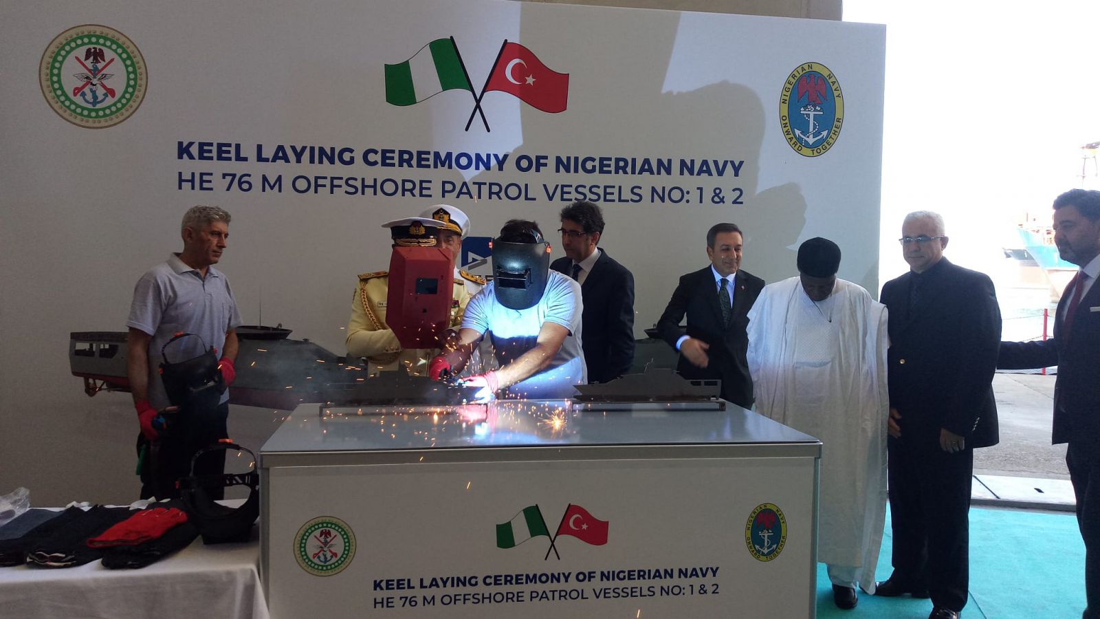Nigerian Ambassador to Ankara İsmail Yusuf ABBA, Minister of Defense of the Federal Republic of Nigeria Bashir MAGASHI, Commander of the Turkish Naval Forces Admiral Ercüment TATLIOĞLU, Deputy Minister of National Defense Muhsin DERE, Nigerian Chief of Naval Staff Vice Admiral Awwal Zubairu GAMBO, and President of DEARSAN Shipyard Aziz YILDIRIM attended the ceremony held at DEARSAN Shipyard.
