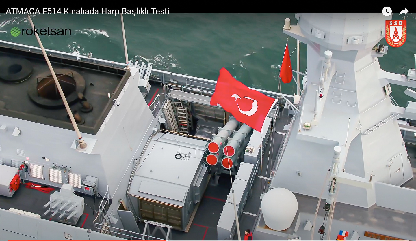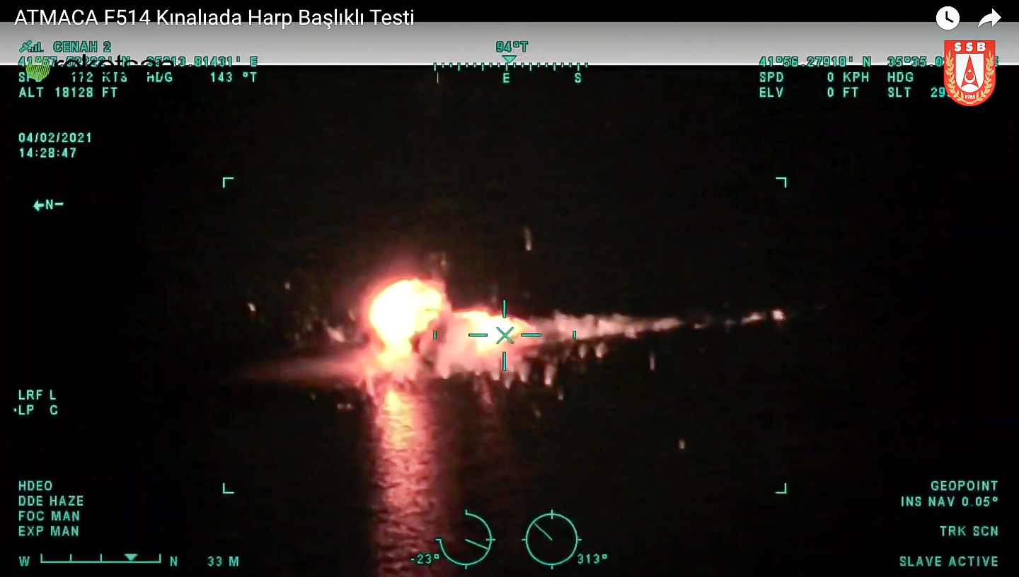 During the telemetry test performed on February 3 in the Black Sea, northeast of Sinop, the ATMACA Anti-ship missile was fired from a 4-cell launcher (similar to Mk-141) placed on the port side of the TCG Kınalıada Corvette and successfully scored a hit on the Roketsan made platform, which imitates a surface target. On February 4, 2021, the second launch test was carried out against a similar Roketsan made platform target with the ATMACA Anti-ship missile using a live warhead, and this time, the target was also destroyed successfully. With the last live firing test, the effectiveness of the ATMACA missile's warhead was also tested for the first time. Both launches from the TCG Kınalıada Corvette were monitored live by the test measurement equipment at the Sinop Missile Test Range (such as radar systems and high-speed cameras that can measure the missile's trajectory and speed) and from the air by a UAV (Call Sign: Cenah 2) using the Star Safire 380 HLD FLIR. President of Defence Industries İsmail Demir announced the tests on his official social media account and congratulated everyone involved for the successful test. "Our first indigenous anti-ship missile ATMACA successfully destroyed the target after fired from our national ship TCG Kınalıada. I congratulate everyone who contributed. Godspeed to our Heroic Navy!" President DEMİR also shared a short video of the test-fires performed on February 3 and February 4 between 14:00 and 14:30. In the video recorded by the UAV flying at an altitude of 18,129ft, the passive ranging maneuver performed by the ATMACA missile at the terminal stage before hitting the platform type target can be clearly seen (during the firing test conducted on February 4).