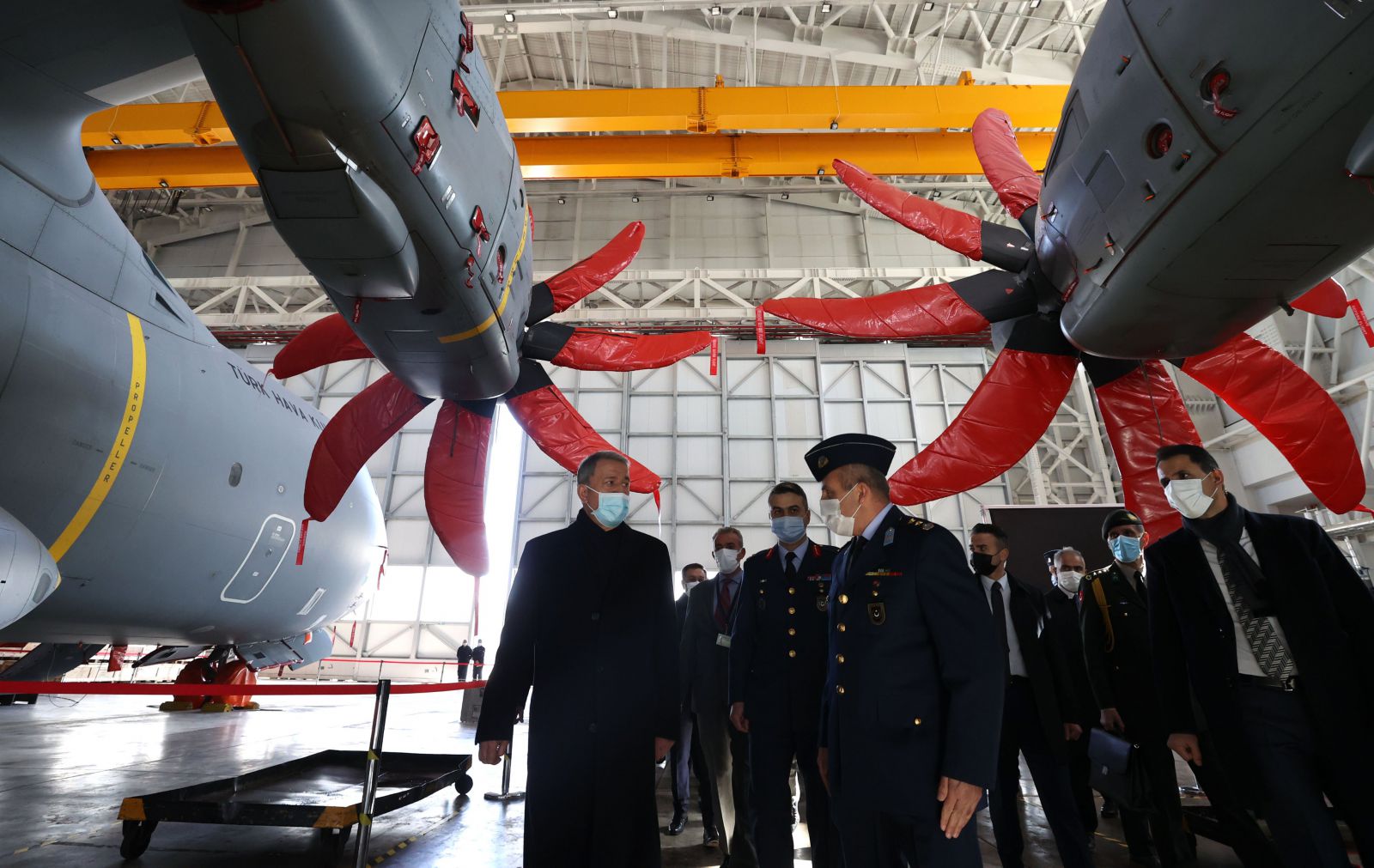 On February 26, 2021 accompanied by Chief of Turkish General Staff (TGS) General Yaşar GÜLER, Force Commanders and Deputy MoND Muhsin DERE, Turkish Minister of National Defense (MoND) Hulusi AKAR visited 12th Air Transport Main Base Command located at Erkilet, Kayseri and get information on the current status of retrofit efforts being conducted at A400M hangar on the first TurAF A400M aircraft at the 2nd AMFD.