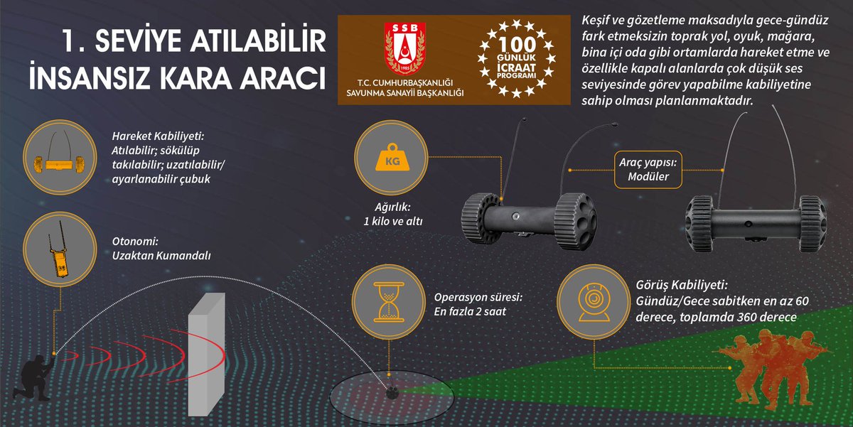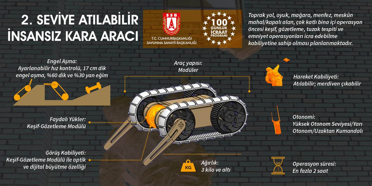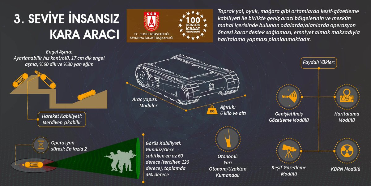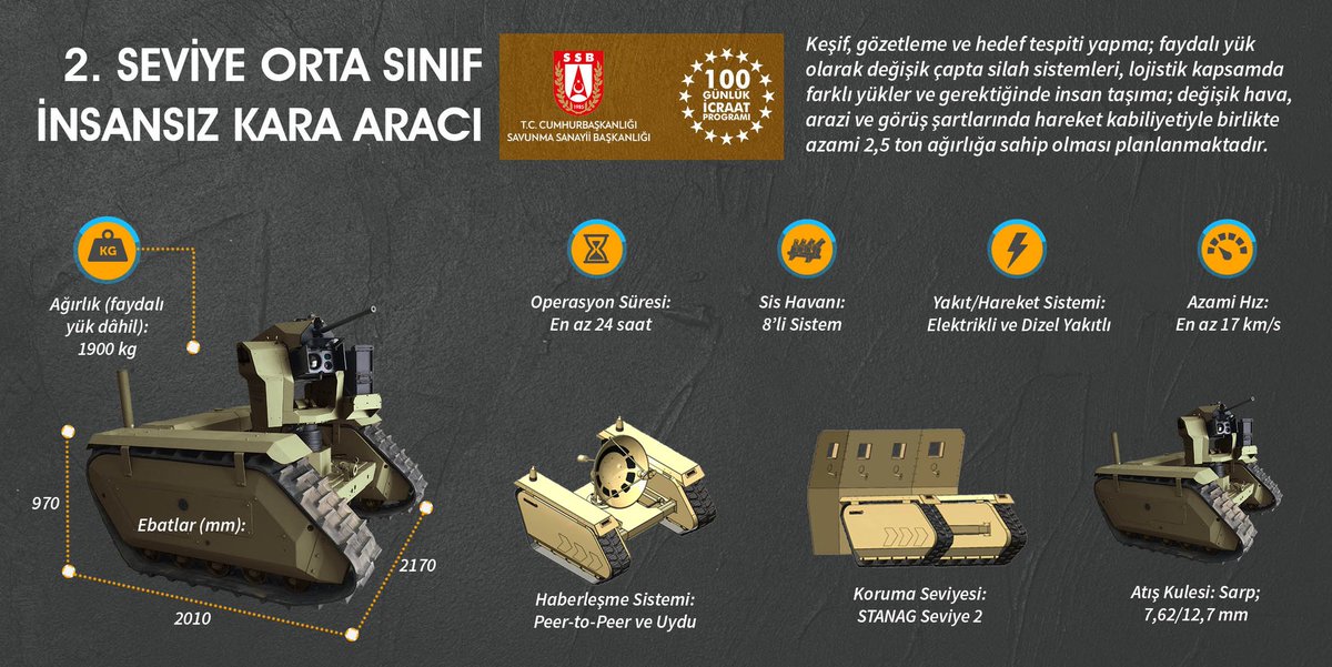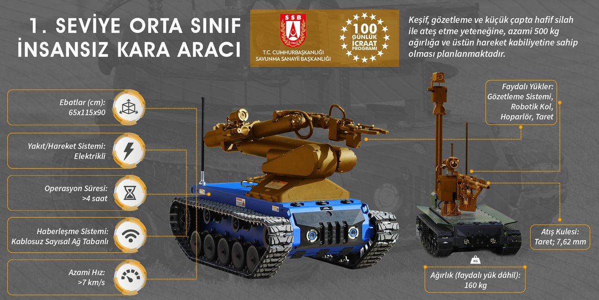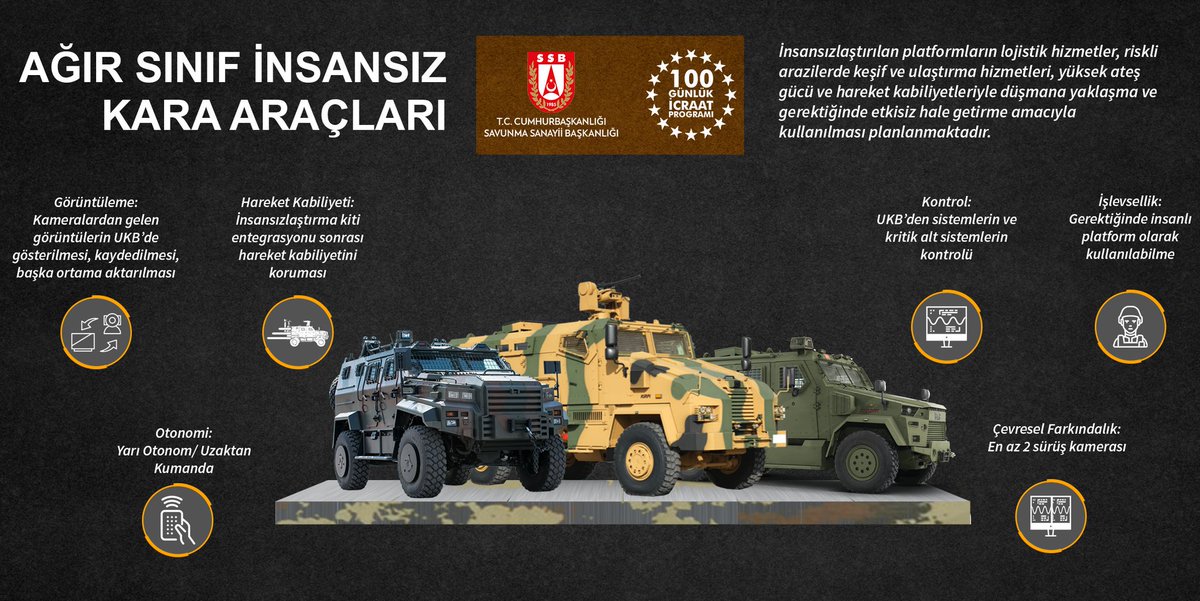 The Unmanned Ground Vehicles project is carried out by the Presidency of Defense Industries (SSB) as part of the Presidential 100-day action plan. The project has three main categories: light, medium, and heavy class, and according to the images shared by the SSB, the heavy class vehicles include BMC Kirpi and Amazon Armored Vehicles and Nurol's Ejder YALÇIN Tactical Wheeled Armored Vehicles.