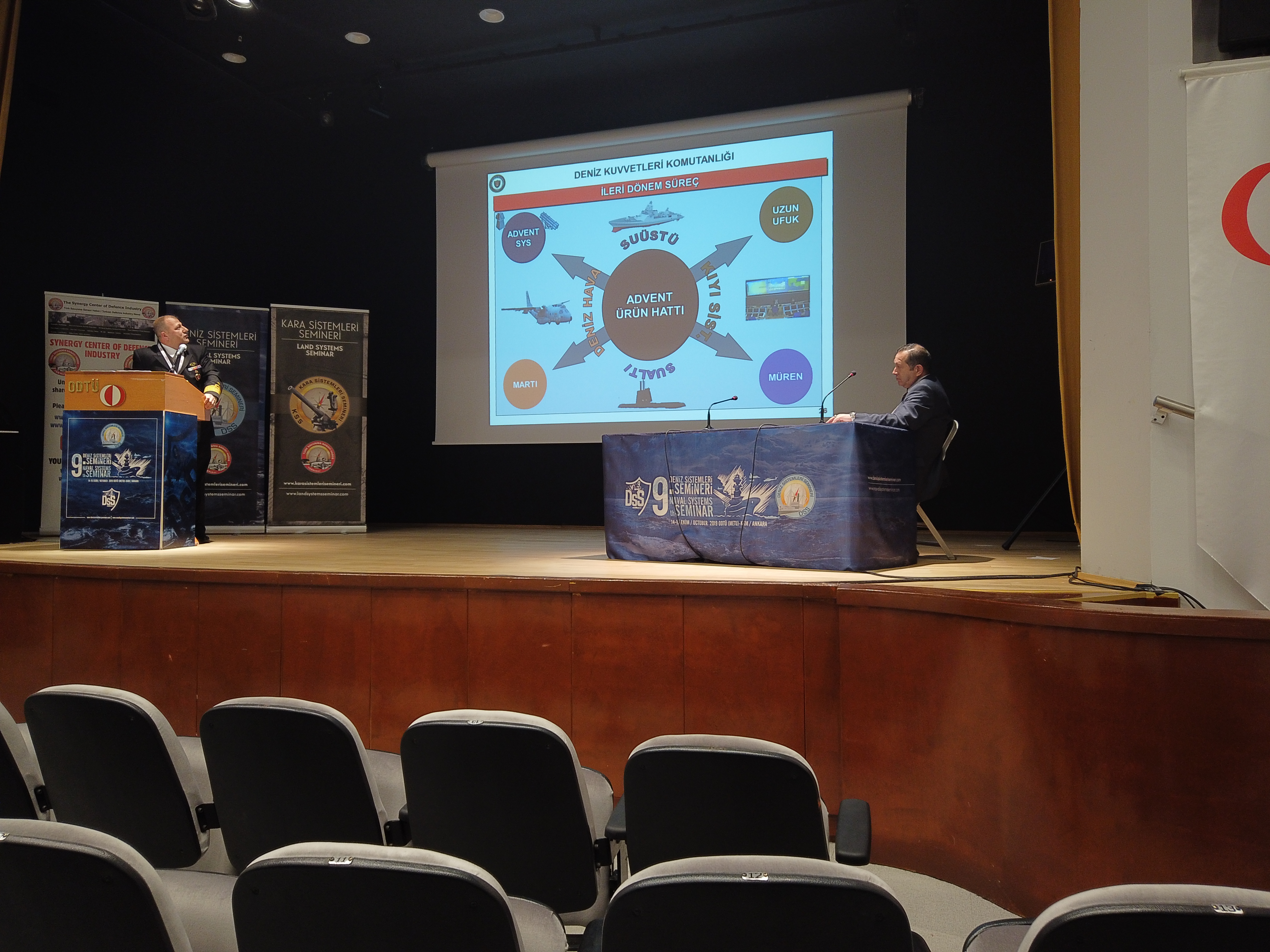 Naval Technical Commander Rear Admiral (Lower Half) Ramis AKIN and Navy Captain Cihat ERYİĞİT made a presentation about the ADVENT Combat Management System (CMS), which began development in cooperation with ARMERKOM/TNRCC and Havelsan in 2010, to meet the need of a modern Combat Management System with Network-Centered Warfare capability.