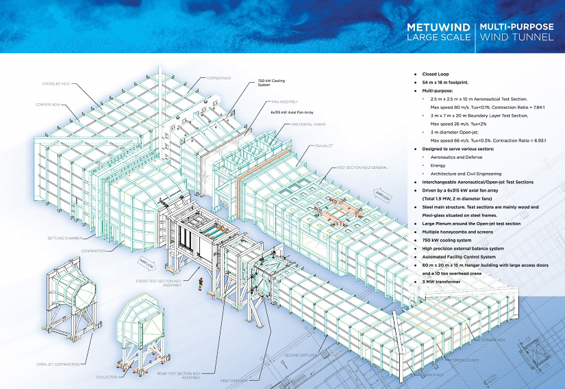 50 metreye 25 metre ebatlarında çelik bir yapı üzerine inşa edilen ve üç ayrı bölümden oluşan rüzgar tüneli, Savunma Sanayi, İnşaat, Otomotiv sektörüne hizmet verecek,.Havacılık sektörüne yönelik dizayn edilmiş test kesitinde İHA, SİHA, savaş uçakları, helikopterlerin pervane ve aero dinamik testleri yapılabilecek. İnşaat sektörüne yönelik olarak da özellikle asma köprü, yüksek bina, farklı mimari şekildeki yapıların, stadyum ve hava alanlarının inşa testleri bu merkezde yapılabilecek. Saatte 340km hıza ulaşabilen bölüm ise rüzgar enerjisi sektöründeki kanat profil testleri için tasarlandı. Tesiste ayrıca rüzgar hızını oluşturmak için her biri 400KW/S güce sahip toplam altı fan yer alıyor.