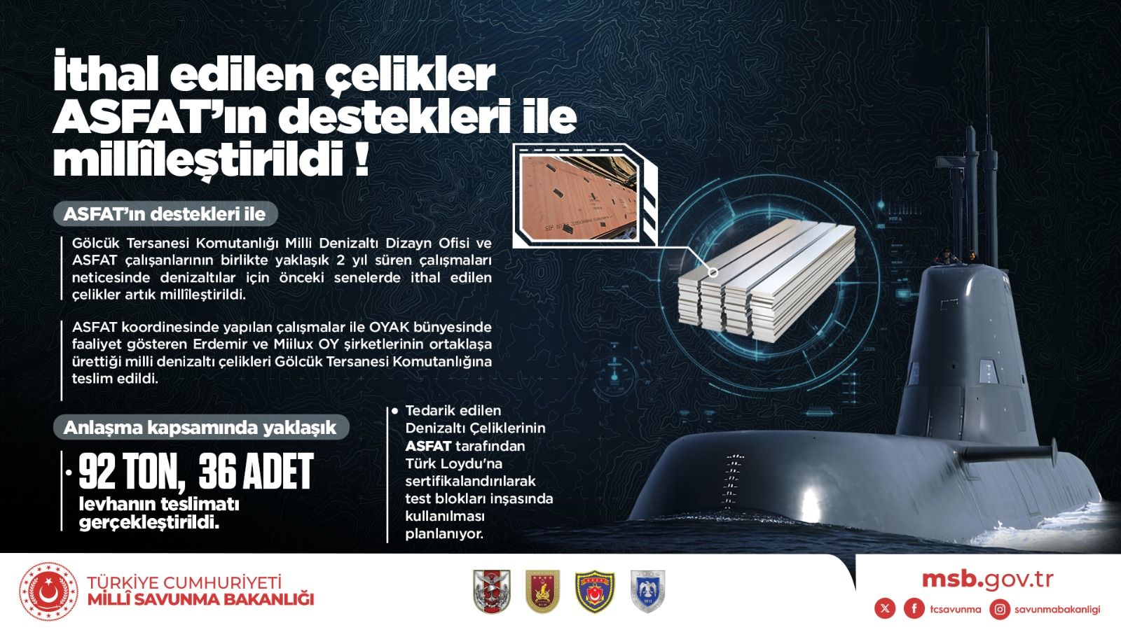 MİLDEN Milli Denizaltı platformu 80+m uzunluğa ve yaklaşık 2.700 ton suüstü deplasmana sahip olacak. MİLDEN mukavim tekne inşasında ASFAT koordinasyonunda yaklaşık 2 yıl süren çalışmalar neticesinde OYAK bünyesinde faaliyet gösteren ERDEMİR (denizaltı inşa sacları her şeyiyle sıfırdan ERDEMİR’de dökülmekte ve ilk haddeleme işlemleri yapılmakta) ve MIILUX OY (ısıl işlem tarafına bakmakta, son haddeleme işlemleri burada yapılmakta ve çelik sac nihai ürün haline gelmekte) şirketleri tarafından üretilecek HY-100 ve HY-130 Denizaltı İnşa Sacları kullanılacaktır. Bu kapsamda Test Bloğunun inşasında kullanılmak üzere 92 ton ağırlığındaki Türk Loydu sertifikalı HY-100 çelik sacları 2023 yılında düz levhalar (36 adet) halinde Gölcük Tersanesi Komutanlığına teslim edilmişti. İnşa sırasında kullanılacak kaynak elektrodu da yine GEDİK HOLDİNG tarafından yerli olarak üretilecektir.
