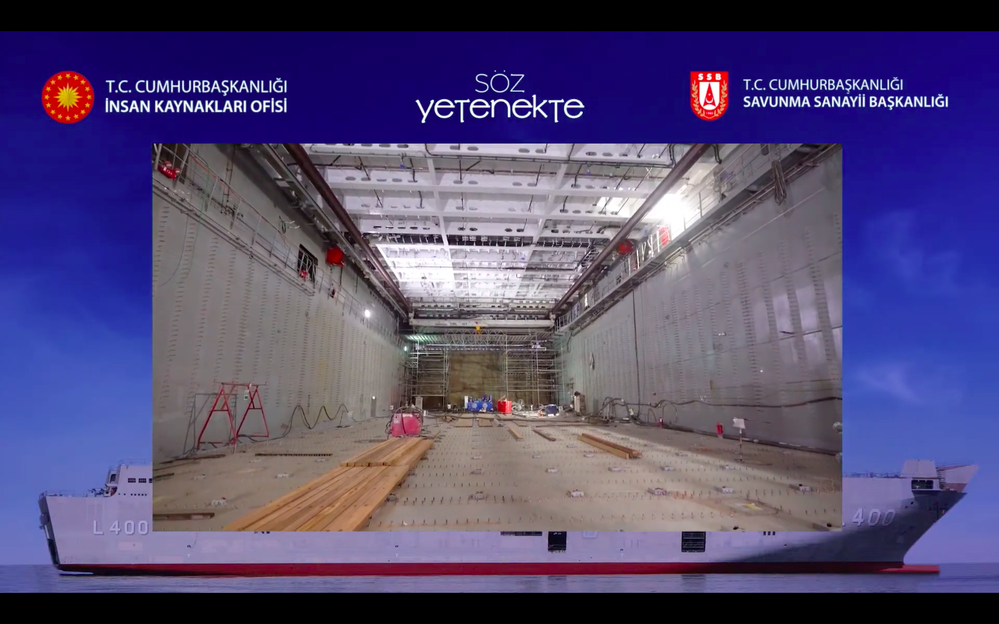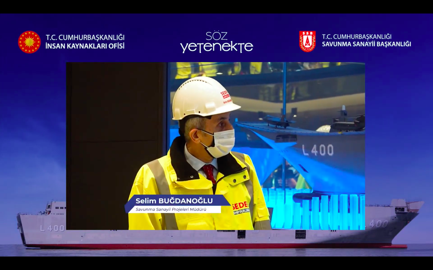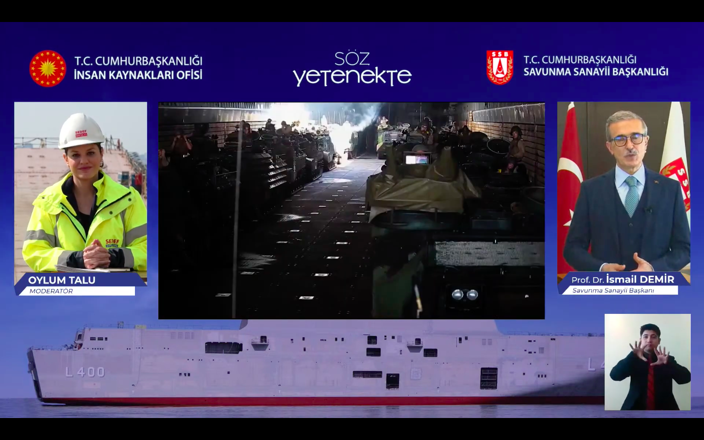 Savunma Sanayi Başkanı Prof. İsmail DEMİR ve Cumhurbaşkanlığı İnsan Kaynakları Ofisi Başkanı Doç. Dr. Salim ATAY bugün, inşa ve donatım faaliyetleri devam eden TCG ANADOLU Çok Maksatlı Havuzlu Çıkarma Gemisinden yapılan canlı yayında Söz Yetenekte programında Oylum TALU’nun sorularını cevaplandırdılar.