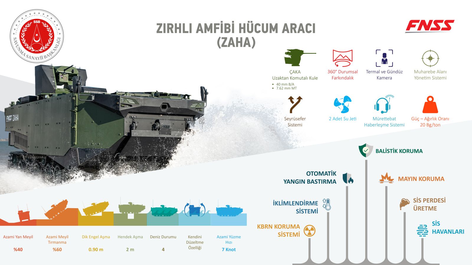 Zırhlı Amfibi Hücum Aracı (ZAHA), amfibi çıkarma birliklerinin ihtiyaçları dikkate alınarak, FNSS tarafından son teknoloji amfibi araç olarak tasarlandı. Bir amfibi çıkarma operasyonu esnasında gemi ile sahil arasındaki mesafeyi en hızlı şekilde alma kabiliyetine sahip olan ZAHA, harekâtın çıkarma safhasında, kıyıya yanaşan havuzlu çıkarma gemilerinden denize inebilmekte ve aradaki mesafeyi yüksek süratle kat ederek, birliklerin koruma altında ve ateş desteği ile kısa zamanda karaya çıkmasını sağlıyor. ZAHA varyantları, Personel Taşıyıcı (Tek Antenli), Komuta Aracı (Dört Antenli), Kurtarma Aracı (Kurtarma Vinci Aparatı Entegre) olarak 3 varyanttan oluşuyor. Ancak kullanıcı isterine göre en az altı araç (Personel Taşıyıcı Araç), geçit açma sistemi alt yapısına da sahip olacak. ZAHA Personel Taşıyıcı araçları ayrıca istenirse Komuta Kontrol Aracına da dönüşebilecek alt yapıya sahip.